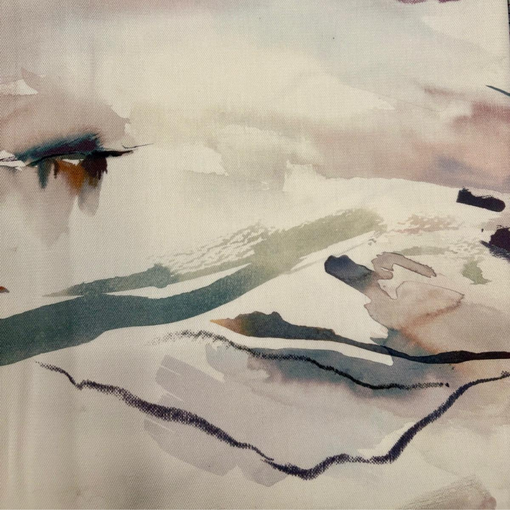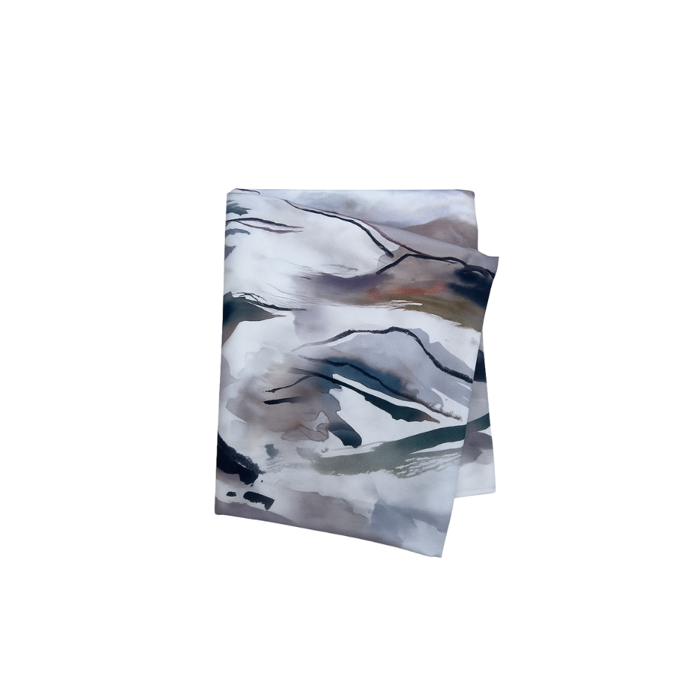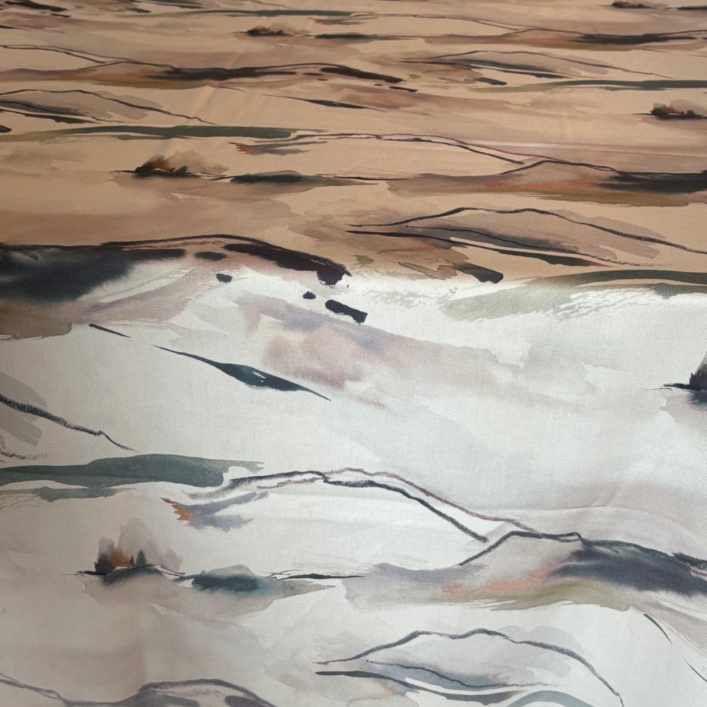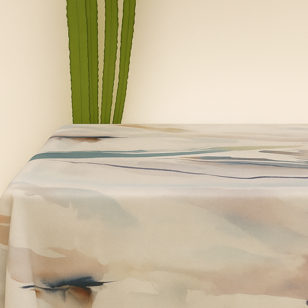 • TOALHA DE MESA COM EFEITO AQUARELA ESTAMPADA EM AZUL E CINZA COM DETALHES EM CASTANHO; 130 x 380 cm