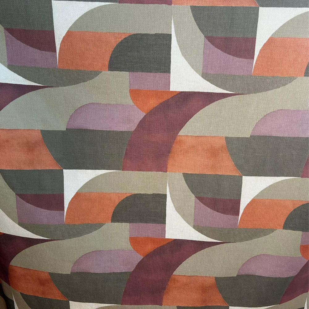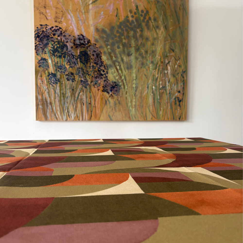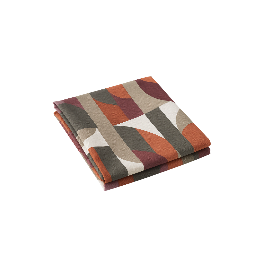 • TOALHA DE MESA COM ESTAMPA GEOMÉTRICA ABSTRATA, COR TERRACOTA OUTONO.