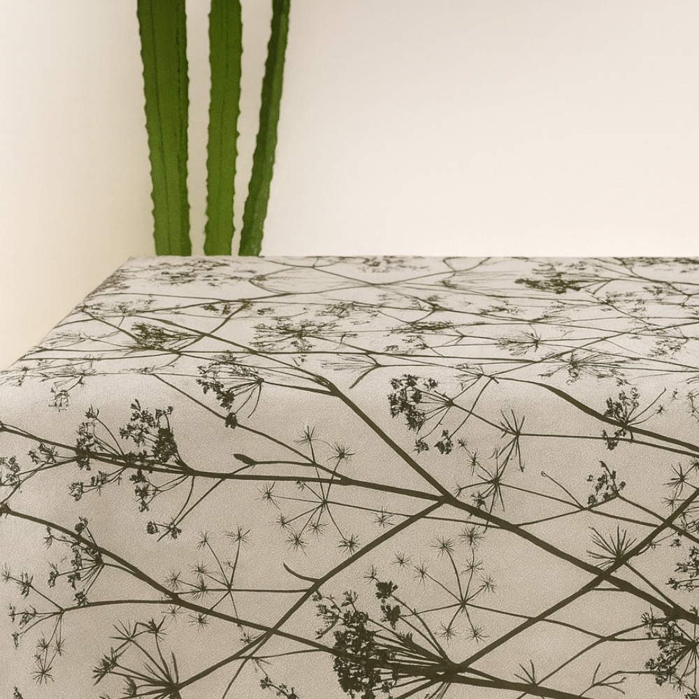 • Toalha de mesa estampada Komorebi, proveniente da floresta japonesa.